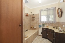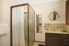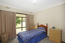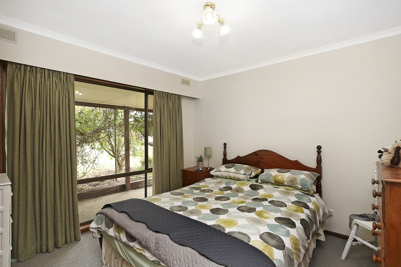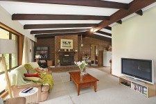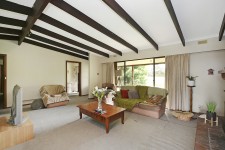Enter a spacious living area with full length windows, with wood heater, which has views over the lawns to the surrounding mature trees.