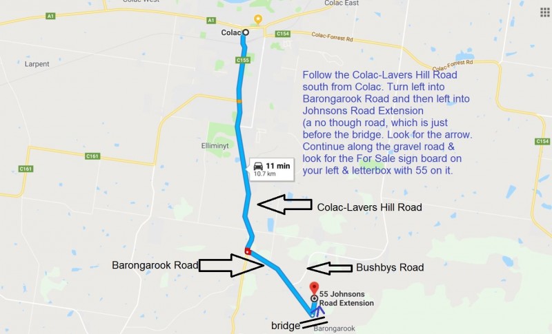 Note: Johnsons Road Extension (a no through road) does not connect with Johnsons Road. Please look for the arrow on the corner of Barongarook Road and Johnsons Road Extension to guide you to the property. See also map of how to find the property.