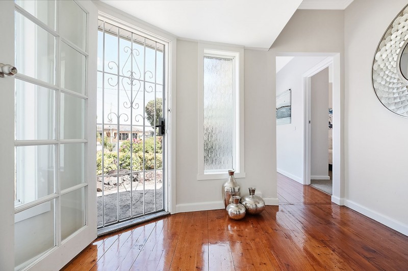 From the moment you step into the unique front entry, the generous open plan layout, which accommodates the light-filled kitchen, family living and dining space, is going to impress. If that doesn’t, the vintage etched glass entry doors to the lounge room will!